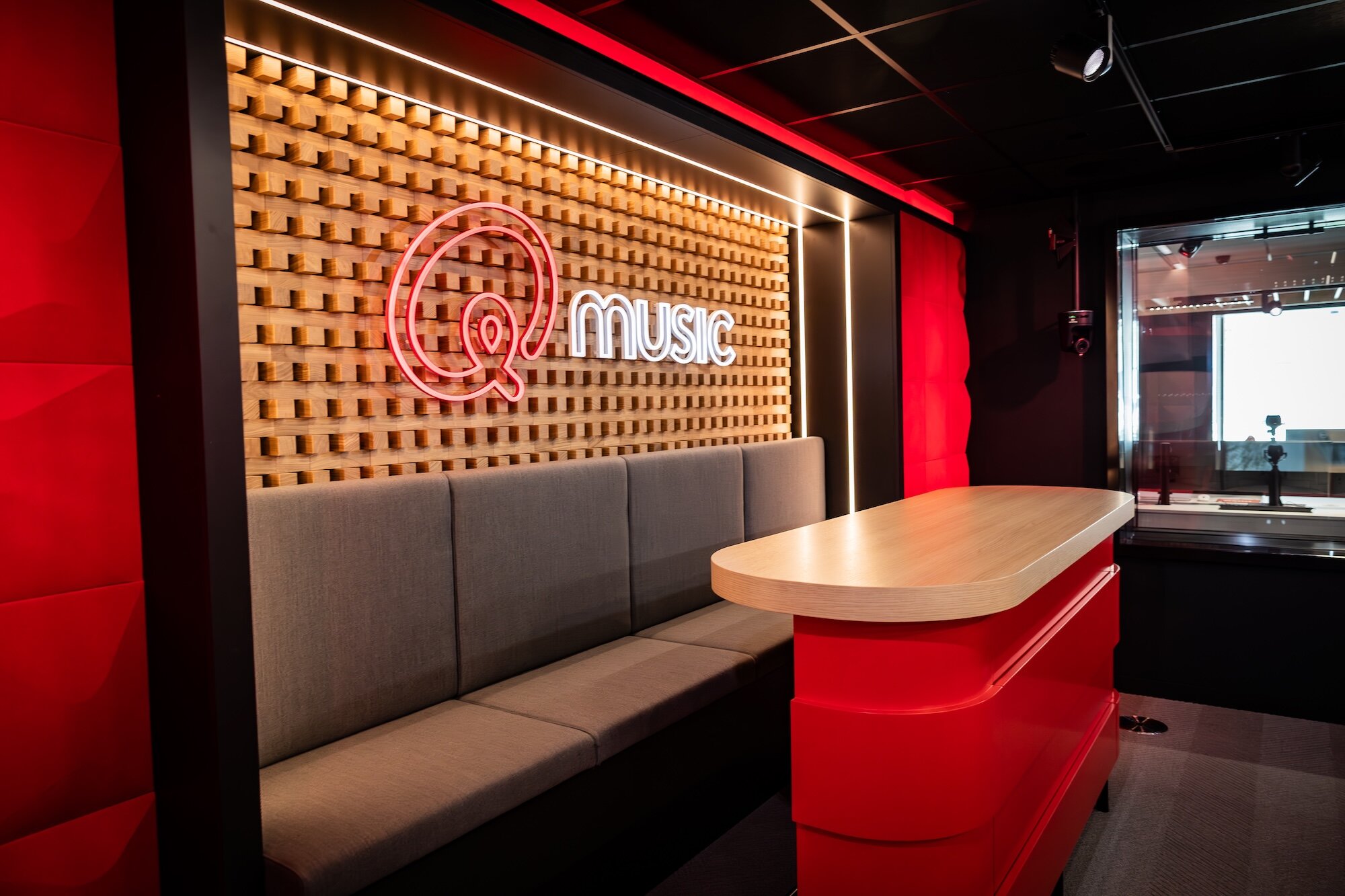 The look of the new studio is a synthesis of traditional and modern elements, Mattie explains. “Lots of foam panels to optimise sound quality, the famous Qmusic red and cameras everywhere. We’re evolving with the times. Our technical department really deserves a lot of credit, because we got off to a flawless start. I figured we’d have all sorts of teething problems in the first six months, but those fears were unfounded. The first time we went live, it was as if we’d already had six months to test everything.”