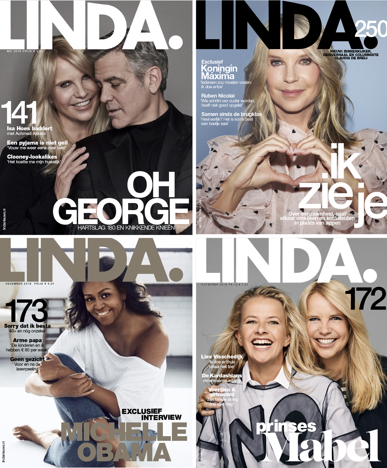 57 times Ahoy “Last year, we had a total circulation of 132,591 for LINDA.magazine and 44,138 for LINDA.meiden. Our total print reach was therefore 942,000.” LINDA.nl “Has an average of 4,473,308 users and 21,572,297 page views per month.” Instagram, Facebook & TikTok “With a total of 1,578,498 followers across all our social media channels, we are the third-largest magazine media brand on social media.” High-profile ­covers “As well as Michelle Obama, we had celebrities such as Mabel Wisse Smit, Mark Rutte and George Clooney in front of our lens.” Exclusive interviews “Over the past year, we’ve had candid conversations with Martijn Krabbé, Queen Máxima and Floortje Dessing, among others.” Mercur “In total, we’ve been honoured to receive this prestigious industry award twelve times.”
