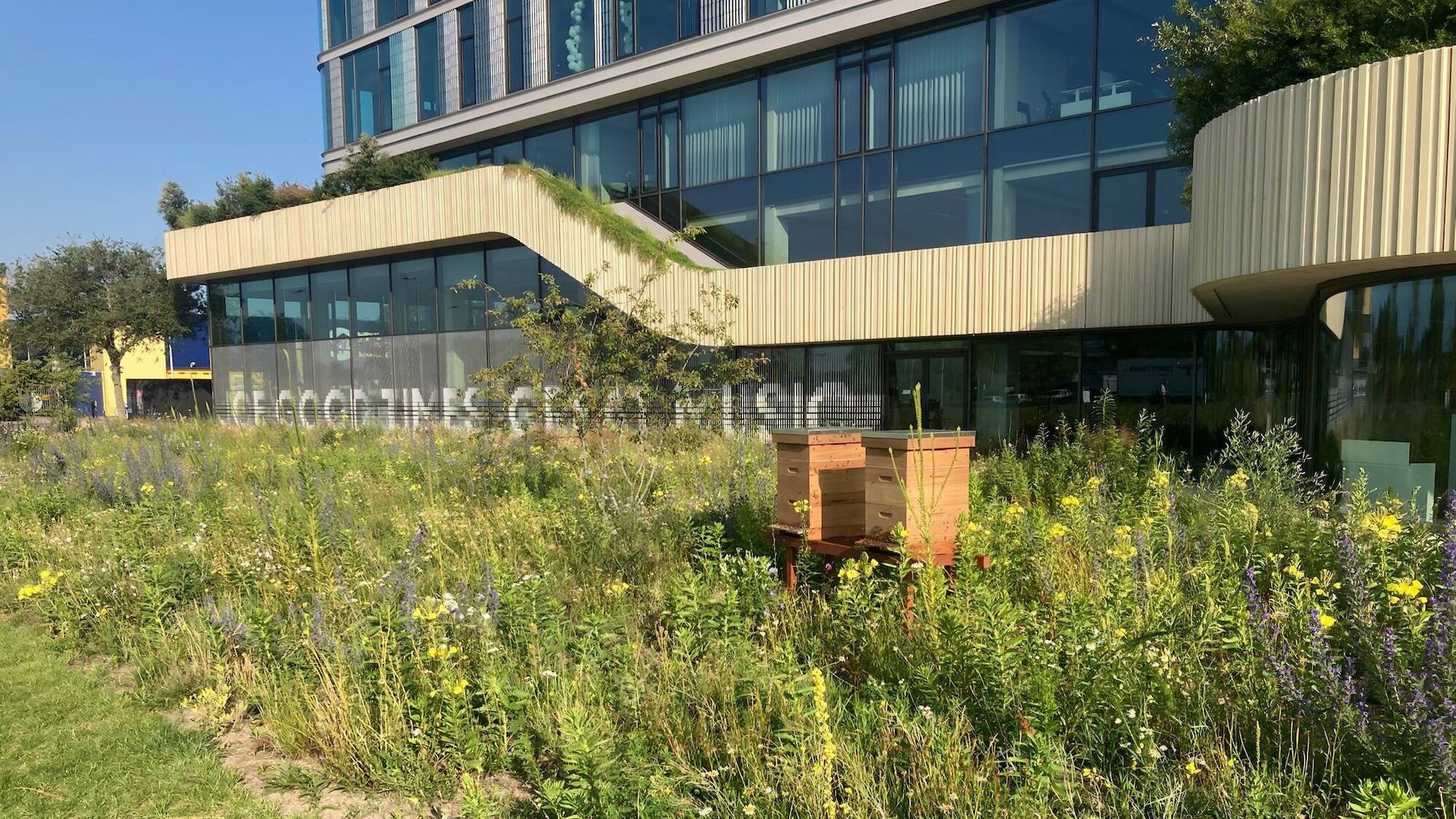 Kleine bijtjes helpen: in Amsterdam en Vilvoorde werden bij de kantoren bijenkasten geplaatst, in aanvulling op eerder aangelegde wilde tuinen, insectenhotels en zwaluwkasten.